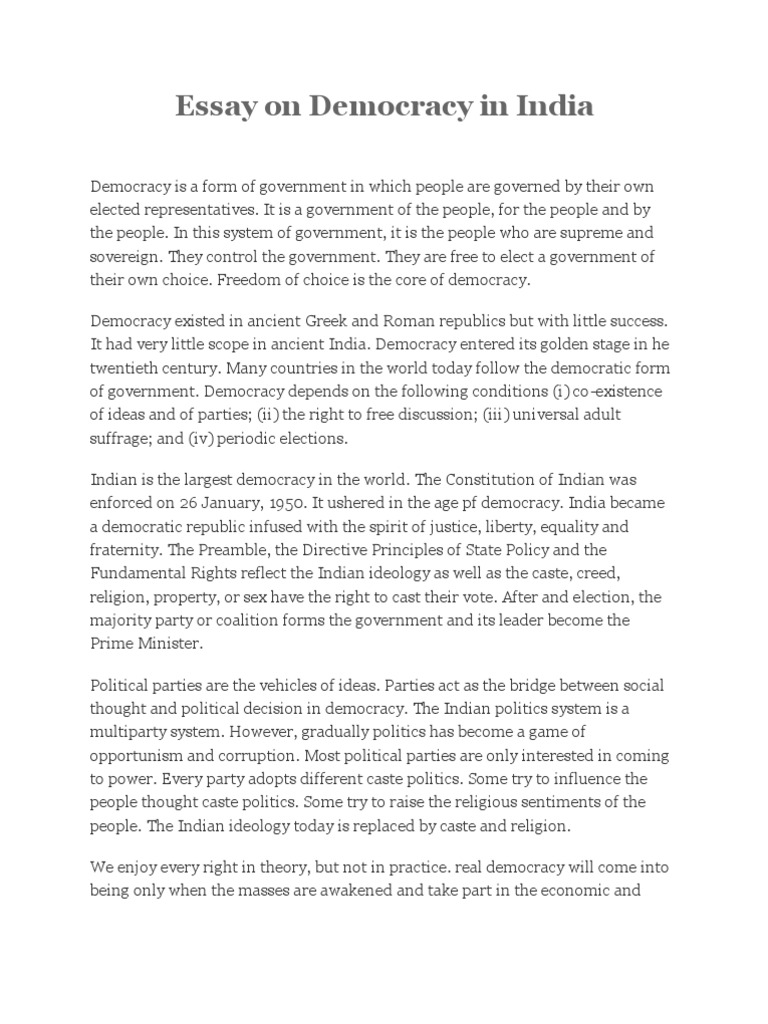 Our country is a secular, democratic republic, and the President is the head of state, and the Prime minister is the head of the government. Citizens elect their leaders by casting votes. The candidate with a majority of votes wins the election and gets into power. Below we have provided Democracy in India Essay in English, suitable for class 6, 7, 8, 9 and 10 school students, democracy in india essay. In other words, the absolute power to elect their representatives lies with the people who form the electorate. So, democracy in india essay, the power resides within the people and is expressed by their opinion and will.